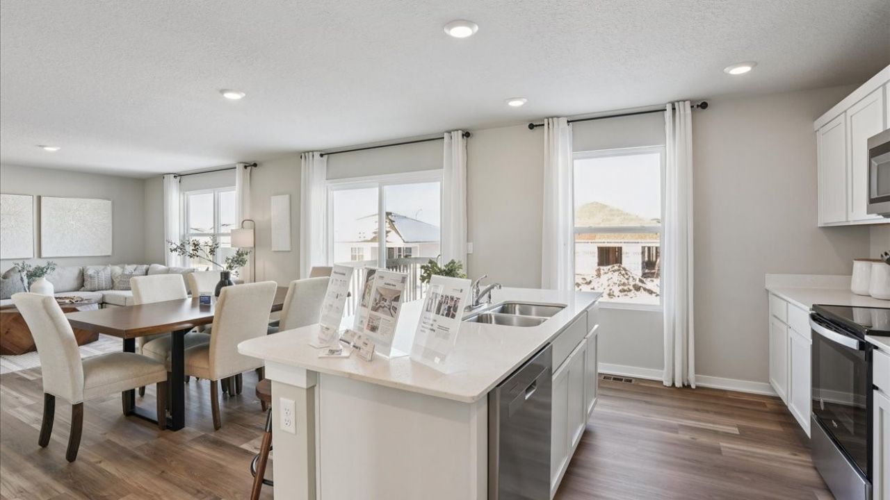 Welcome to the Bellhaven in Edgewood Trail - a 5 bedroom, 3.5 bath home offering 2,556 sq. ft. of finished living space, including a spacious finished basement. Step inside to a versatile front flex room?ideal for a home office, playroom, or formal dining. A guest half bath and staircase lead to the open-concept living area, featuring 9-ft ceilings, an electric fireplace, large windows, and a bright, spacious feel. The kitchen showcases white cabinetry, subway tile backsplash, stainless steel appliances, a walk-in pantry, and a large island perfect for casual dining. Upstairs, a centrally located laundry room is surrounded by three secondary bedrooms, a full bath, and a linen closet. The expansive primary suite offers two walk-in closets, a double vanity, walk-in shower with ceramic tile, and private water closet. The finished daylight basement includes a rec room, fifth bedroom, and a full bath. Visit today for a personal tour! Ask about builder incentives with preferred lender. Photos similar to.