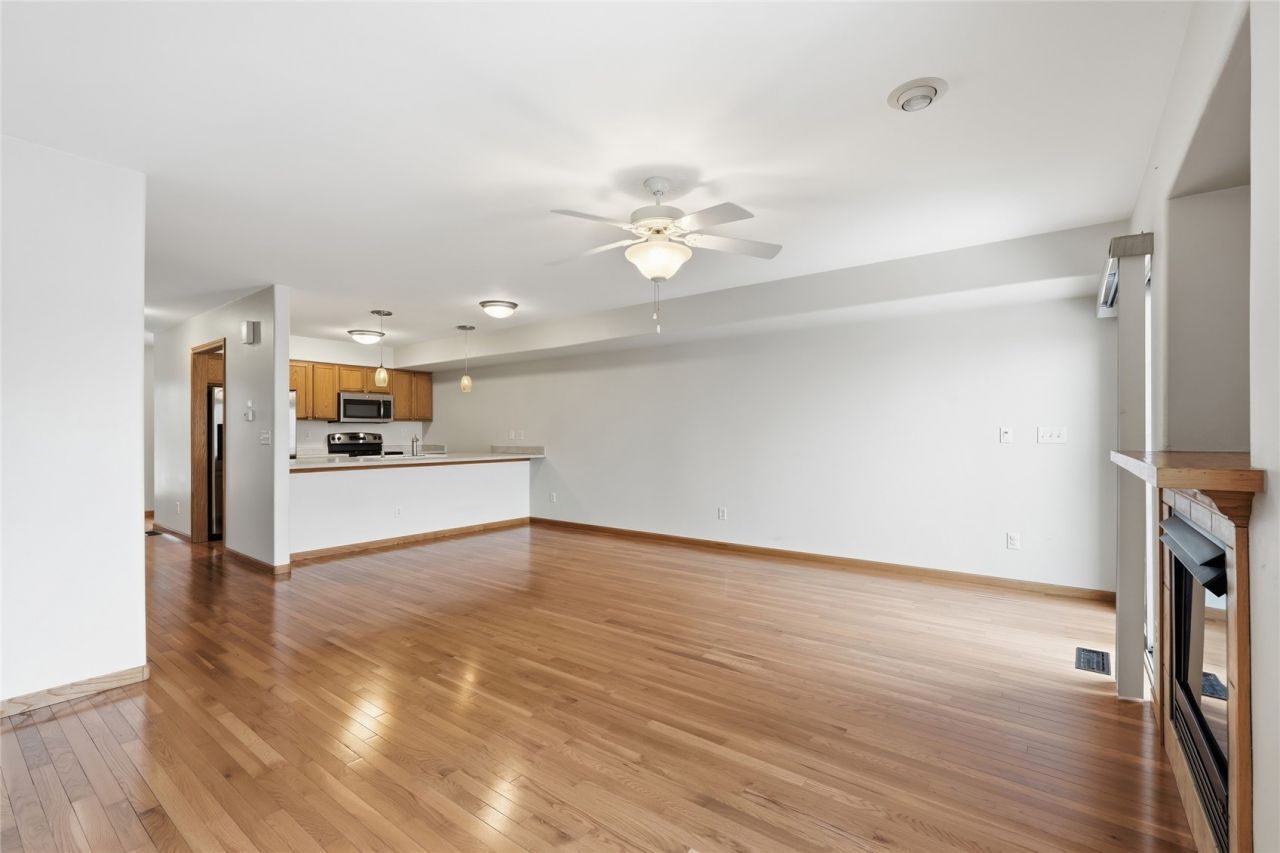 Move-in-ready townhouse with updated hardwood flooring throughout the main level, and an open floor plan with sunny south-facing windows, looking out to a private green space, perfectly positioned so no neighbors face your windows directly. Gas fireplace in the open living room, sliding door from the open dining area to the deck, which spans the length of the home. The upper level includes two spacious bedrooms with vaulted ceilings, one with a private bathroom, and an additional full bathroom with extra wide bathtub. Large drive-under garage connects to a multi-use room with brand new waterproof tile flooring. Ideal location a block from bus route and near parks, trails, restaurants, and UI Healthcare. Other maintenance items include: Garage springs replaced 2025, building roof around 3 years old, basement flooring 2026, hardwood floors 2019, disposal replaced 2018.